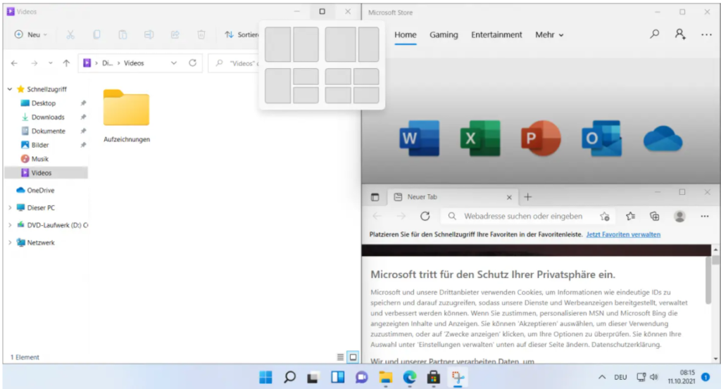 Mit den Snapping Layouts können Sie Fenster an den Bildschirm anpassen.