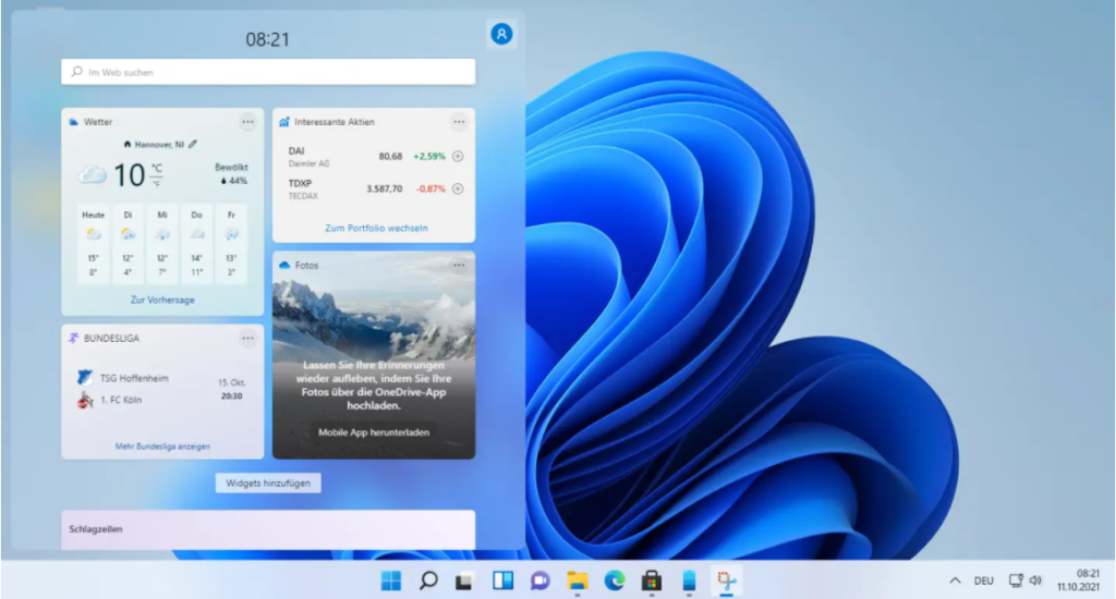 Mit Windows 11 führt Microsoft Widgets ein, die denen der mobilen Betriebssysteme ähneln. Sie können die neuesten Nachrichten, Ihre persönlichen Fotos aus OneDrive, Sportergebnisse, Aktienkurse und vieles mehr abrufen. Der Widget-Bereich ist anpassbar und nach Ihren Interessen personalisierbar. Bei Tablets mit Windows 11 füllt das Widget-Fenster den gesamten Bildschirm aus, sodass Sie alle Ihre persönlichen Interessen in einem einzigen Dashboard zusammenfassen können. Benutzer, die diese neue Funktion nicht mögen, können das Windows-11-Widgets-Panel mit wenigen Klicks deaktivieren.